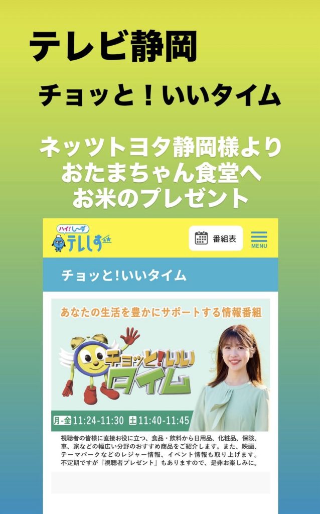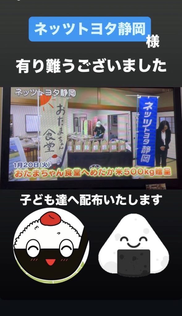 カテゴリー お知らせ 開催報告 2月10日 ネッツトヨタ静岡様 お米の贈呈式がテレビ静岡《チョットいいタイム》で紹介していただきました 投稿者 作成者: otamachan 投稿日 2026年2月10日 2月10日 に1月20日に行われました ネッツトヨタ静岡様 お米の贈呈式がテレビ静岡《チョットいいタイム》で放映させました📺 テレビ静岡様 静岡新聞様 有り難うございました 作成者: otamachan 一般社団法人おたまちゃん食堂は、ママとこどもたちをサポートします。 アーカイブを表示 → ← 2月9日は おたまちゃんスクールでしたが…⛄️雪のため中止となりました☺️子ども達は… → 2月11日は若松町の移動駄菓子屋さんでしたが…☔️。゚(゚´ω`゚)゚。